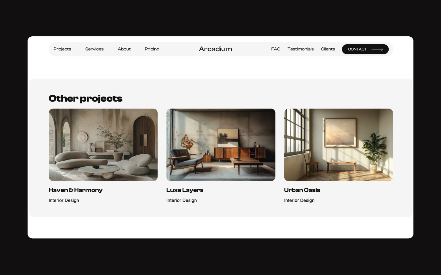 Arcadium template elevates professional portfolios with its sleek, responsive design. Tailored for interior designers and architects, it showcases work through modern layouts that adapt seamlessly across devices creating a visually compelling online.