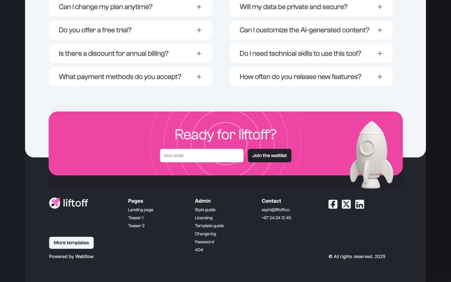 A modern Webflow one-page template designed to help AI startups launch fast. Collect waitlist signups, showcase features, and validate your product - all on a sleek, high-converting landing page. Perfect for AI tools, SaaS, and early access launches.