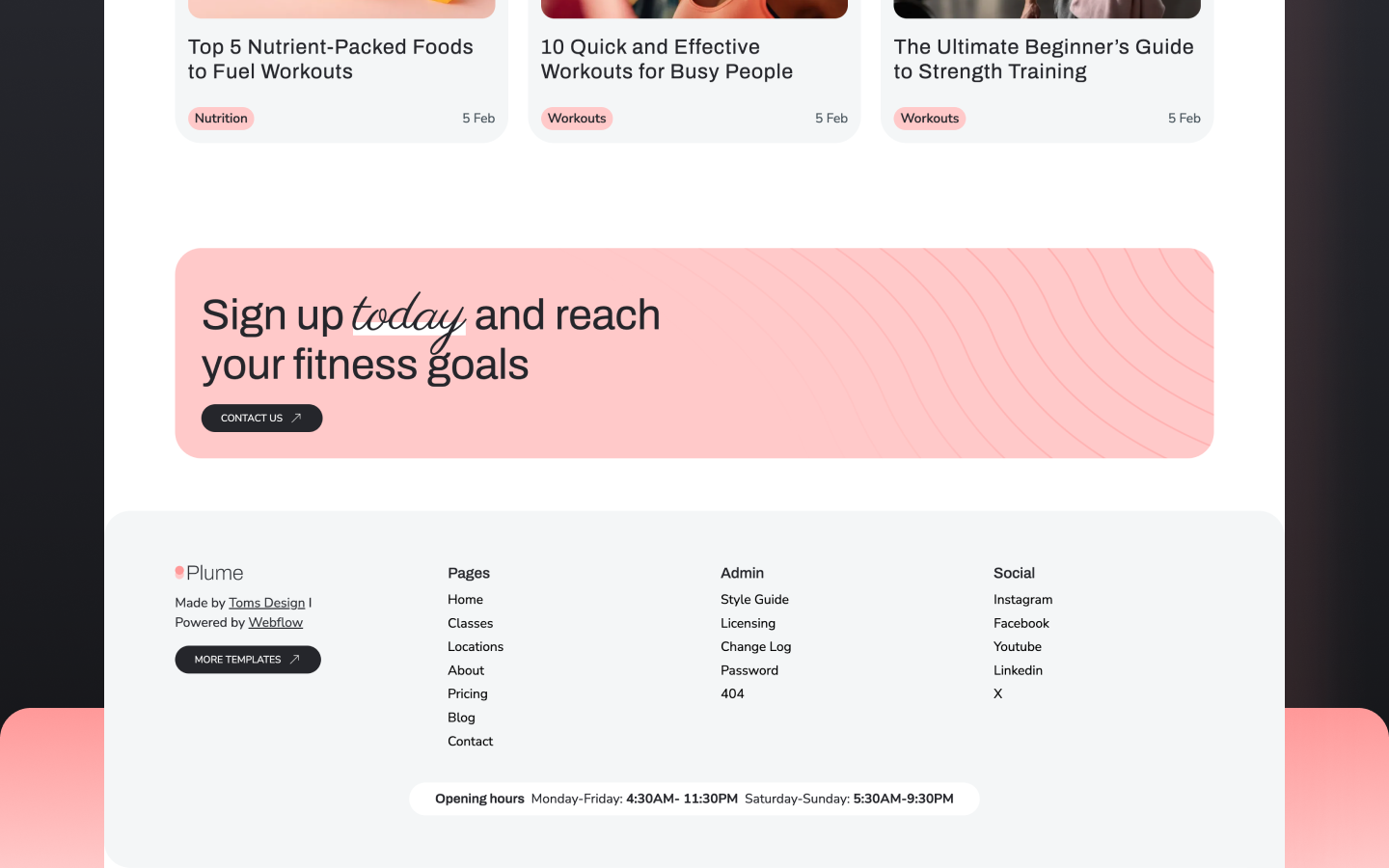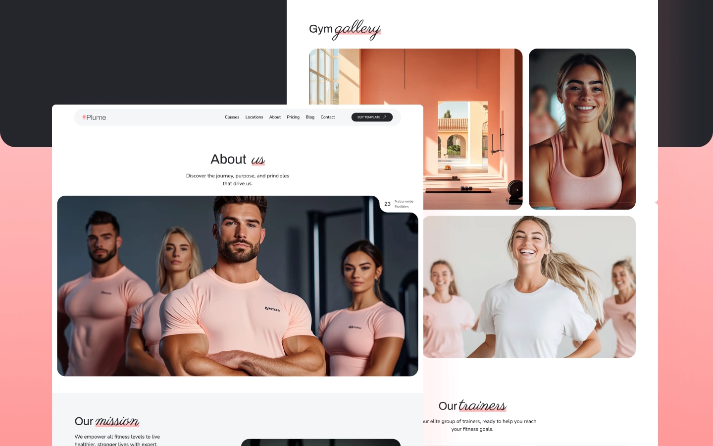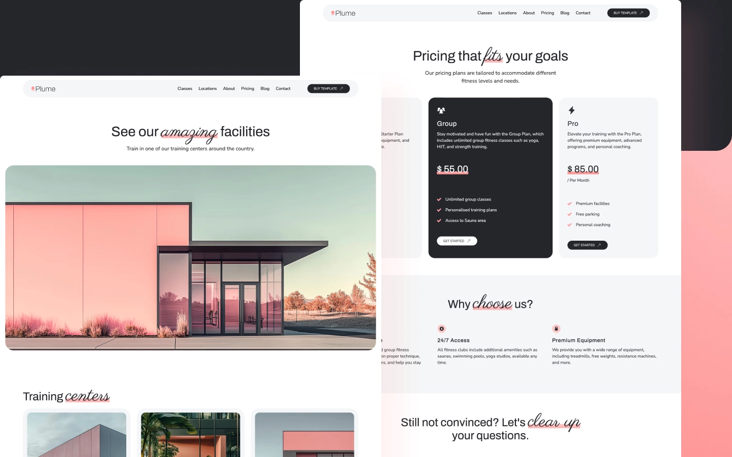 Plume Webflow fitness template is perfect for gyms, trainers, and wellness brands. Fully responsive, fast, and easy to customize featuring SEO optimization, CMS, smooth animations, and modern and clean design to help grow your business!