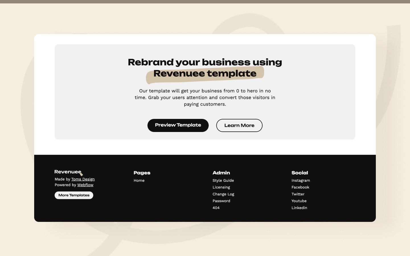 Meet Revenuee - a sleek Webflow landing page template designed to help your business shine. Build your brand, captivate your audience, and drive clicks with a professional, high-performing design tailored for success. Grow your revenue today!