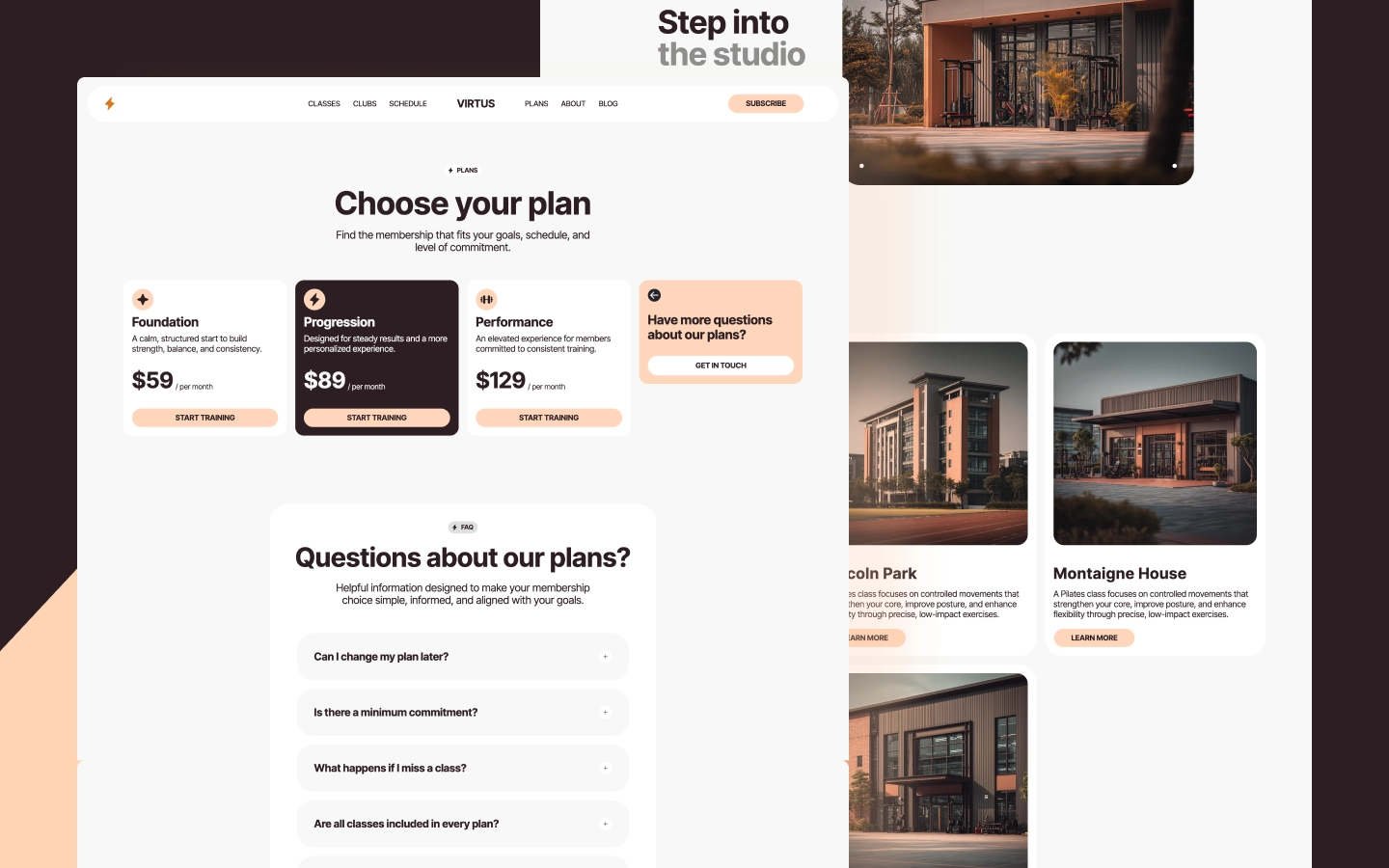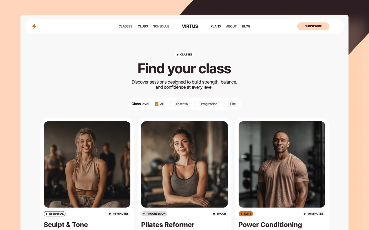 A thoughtfully designed fitness website template for modern studios and gyms. It blends elegance with functionality, showcasing classes, memberships, events, and community in a clean, welcoming layout that feels inspiring and easy to use.